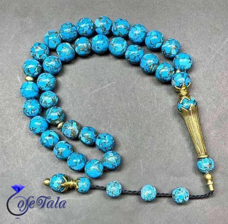 خانه فروشگاه تسبیح فیروزه تسبیح فیروزه قجری تراش دست با رگه‌های طلایی کاملاً کلکسیونی و موزه‌ای